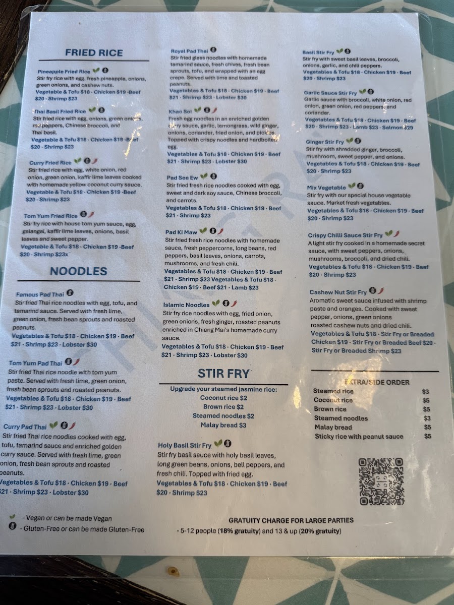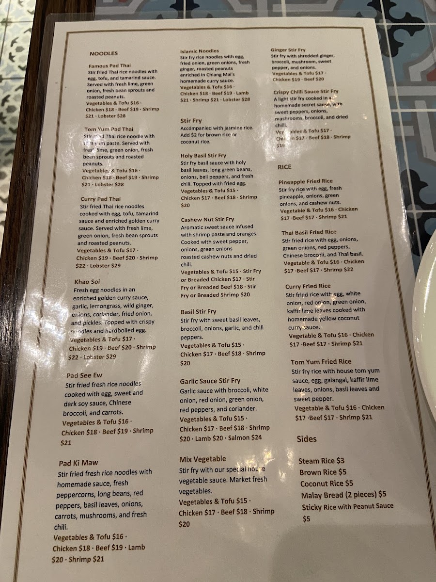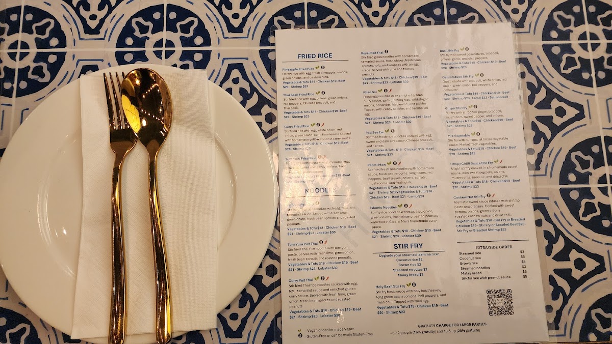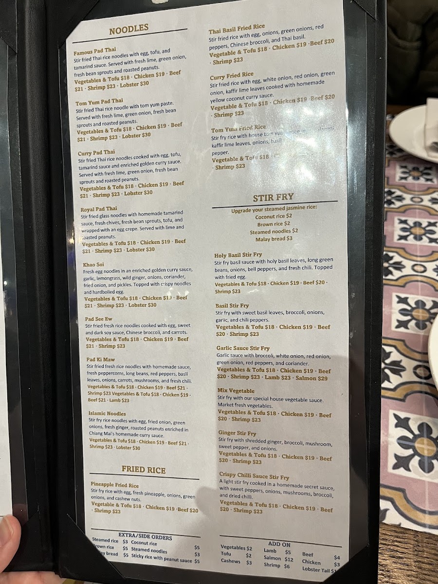 The noodles section includes specialties such as Tom Yum Pad Thai, Khao Soi, and other stir-fried rice noodle dishes. These dishes are typically served with fresh herbs, vegetables, and a variety of proteins.