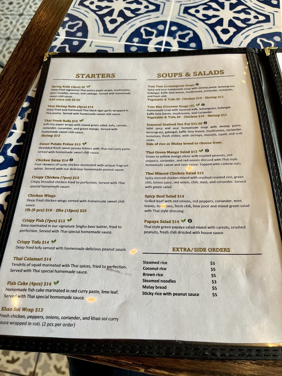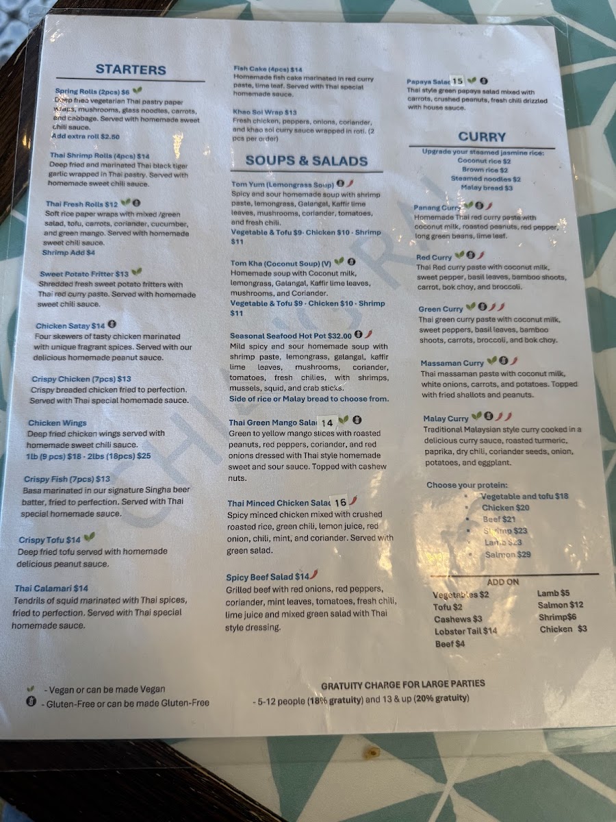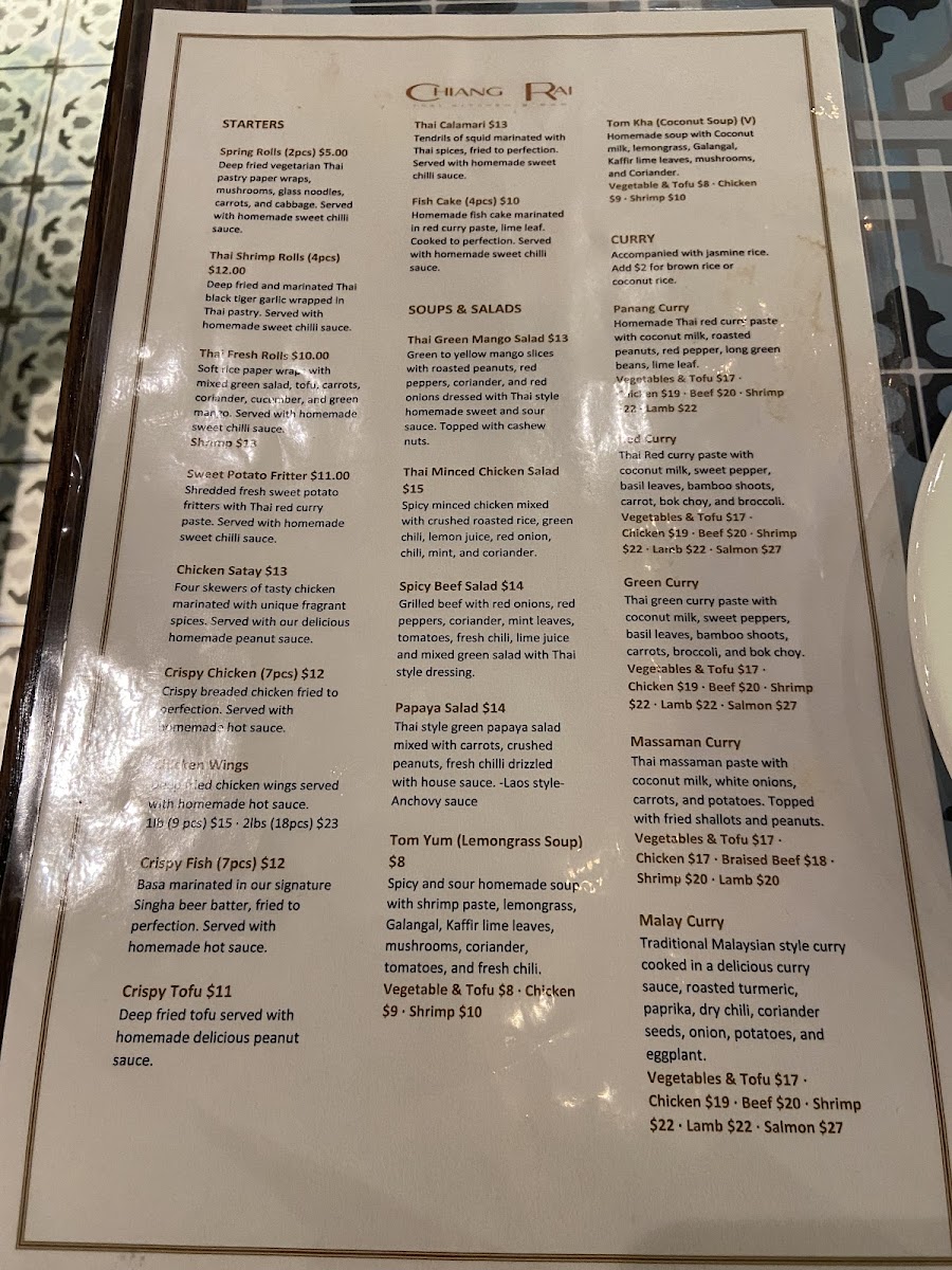 The menu at Chiang Rai Thai Kitchen in North York offers a diverse selection of traditional Thai dishes organized into several categories. Guests can choose from a variety of soups, including classic options such as Tom Kha (Coconut Soup) and Tom Yum (Lemongrass Soup), both prepared with authentic Thai herbs and spices.