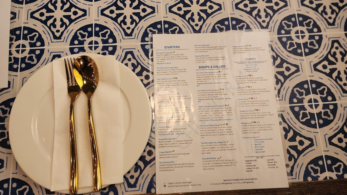 Additional menu items include appetizers and light bites such as Thai Shrimp Rolls, Thai Fresh Rolls, and Crispy Tofu, which complement the main courses. Desserts like Mango Sticky Rice are available to complete the meal experience.
